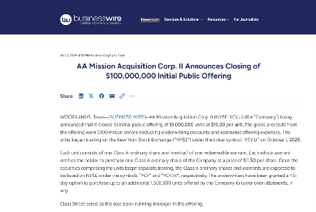 預菜產業園發展(廣東)有限公司董事長金紹紅先生於2025年4月28日,在深圳向全球發佈:赴美國紐約證券交易所主板上市上市倒計時儀式,同年2025年6月10日完成美國紐約證券交易所上市股票交易代碼辦理備案,7月22日向美國證券交易交易委員會遞交上市檔及招股說明書 2025年10月1日,預菜產業園發展(廣東)有限公司於美國紐約證券交易所正式掛牌上市(交易代碼:YCY) 從發起到上市全程僅用158天震驚華爾街